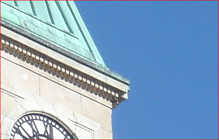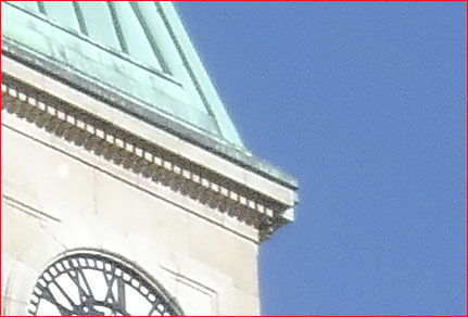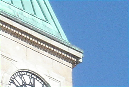 InFigure 1above we see the full frame of a photograph taken by a current-model 5 megapixel digicam. Below inFigure 2is a 100% crop showing a corner of the tower and some clear sky. The sky isn’t perfectly free of noise, but in an 8X10" print what little noise there is is negligible.