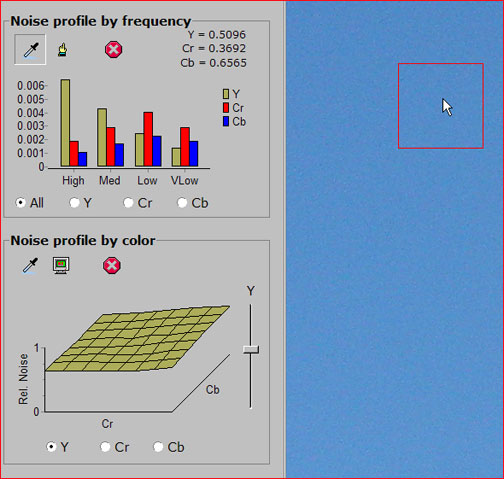 InFigure 4above you see part of the user interface and some of the sky in the ISO 400 image. To process this image you select the eyedropper tool from theNoise Profile by Frequencybox and click on an area which contains noise but no detail. The bar graph shows an analysis of the noise, but this need not concern you. The next step is to choose the eyedropper tool from theNoise profile by colorbox and click on several areas of different colour that display noise but no detail.