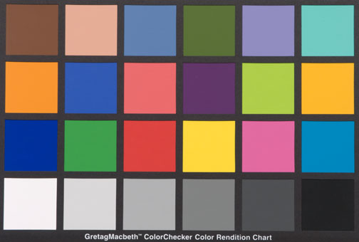 Skin tones are slightly pinker than the second from top left square, while greens seem desaturated. Bluish-green (upper right) is rendered very accurately. All the other colours reproduce very accurately, except for orange-yellow (second down on the right) which is slightly too deep in tone. Red is a little low in intensity but magenta and purple are accurate.