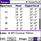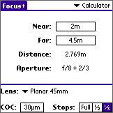 For many photographers the passing of the days when all lenses had depth of field scales is lamented. There are, of course, books of DOF tables available and also pocket slide rules. But, if you own a Palm there is now a wonderful alternative calledFocus+.