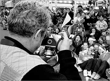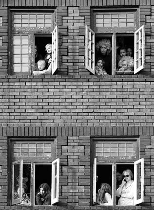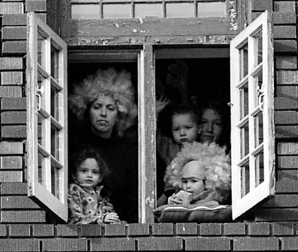 Another aspect of shooting a parade is watching the people in overlooking windows who are in turn watching the parade. The most interesting aspect of this is that the people in the various windows are unaware of those in theotherwindows. This can create fascinating juxtapositions.