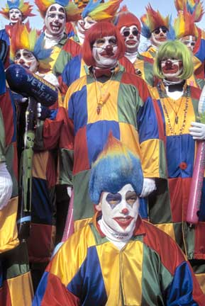 We arrived at the parade’s staging area about an hour before start time. There were hundreds of costumed clowns, marching bands and other participants milling about. Everyone was in a festive mood. It turned out that the official clown photographer (I’m not kidding) hadn’t shown up, so I got roped into doing some clown portraits and group shots for the parade organizers. Great fun.