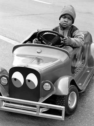 This little guy was one of several kids driving toy electric cars as part of the parade. He seemed pretty overwhelmed by the whole thing. I took several frames, but this one, where his eyes are so expressively in counterpoint to the car’s "eyes", was the most appealing of the set.