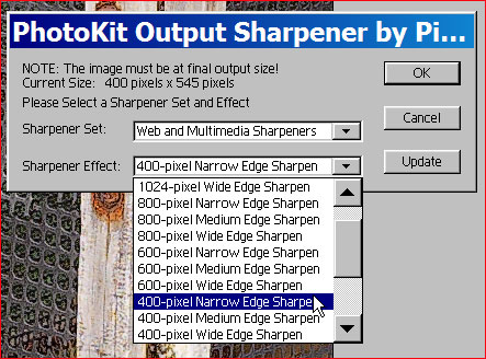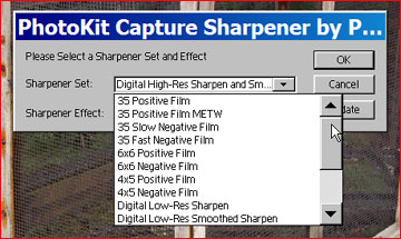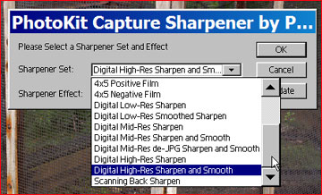 PK Sharpeneris available for both Windows 98 / XP for Photoshop 6 and 7, and Mac system 8.6 (Photoshop 6), Mac system 9.x and up (Photoshop 6 & 7) and OS X 10.1.3 and above (Photoshop 7.x). No mention of Photoshop 8, but there is no question that it will operate in the new version when released. And, whilePK Sharpeneroperates only in 8 bit mode in Photoshop 6 & 7,ifPhotoshop 8 supports 16 bit mode for more operations, (please note the "if"), I wouldn’t be surprised to seePK Sharpenerwork in 16 bit mode in this new version. (How’s that for mealy-mouthed equivocation?)