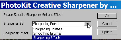 This is the "meat" of the program, and where some of its more sophisticated capabilities can be seen and explored. There are three initial choices, as seen inFigure 7below —SharpeningandSmoothing BrushesandSharpening Effects. Let’s deal withSharpening Effectsfirst.