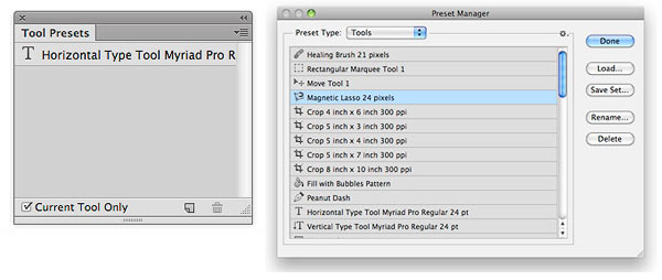 Presets can now be created and saved for any tool using theTool Presetdialog box available under the Window menu. Once you have created some presets you can export them with the preset manager so that they can be used on a different computer or shared with another Photoshop user.