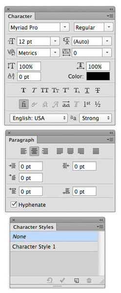 The new text tools are found in the Window menu in the dialog boxes titled Paragraph and Character. These are very useful for defining new type settings. A character style dialog box is also available to save your settings and to share them with others.