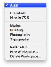 I prefer a light color interface so I changed that immediately. As in CS5, you can customize the interface so that it looks exactly the way you want it, then save it under the name of your choice and recall it whenever you wish. CS6 comes with a number of preset interfaces optimized for specific tasks such as design, etc. I saved mine under the name “Alain” you can see it here together with the preset CS6 Interfaces: