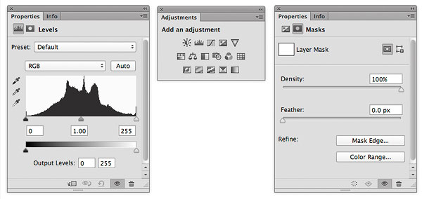 The Adjustment and properties dialog boxes, available from the Window menu, are now presented in two separate windows making it easier to select a specific adjustment layer and set the exact properties for that layer. However, the layer mask options dialog box now opens from the properties dialog box by clicking the mask icon at top left. It no longer has its own window as it did in CS5: