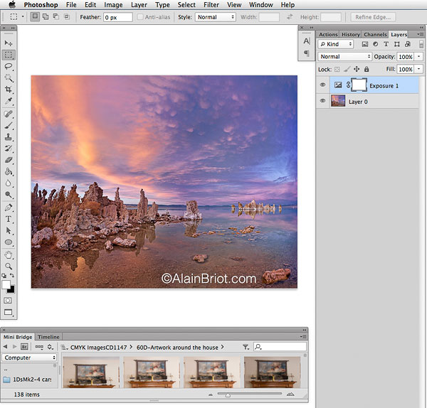 Bridge is now available under the File Menu. You can also open a smaller version of Bridge called Mini Bridge under the File menu or by going to the Window menu and doing Window>Extensions>Mini Bridge. Mini Bridge opens as a window at the bottom of the Photoshop window. This windows works as a film strip, very much like Lightroom, making it useful when you need to browse through raw files quickly then work on them in Photoshop. Clicking on a raw file in Bridge or Mini Bridge opens it in Camera Raw where you can set the conversion settings then open it in Photoshop.