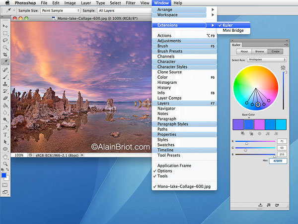 I like to use Adobe Kuler to find color harmonies and to help me with other aspects of color work (see myseries of essays on Color Harmoniesfor more information about my use of color). So far I had to access Kuler outside of Photoshop. In CS6 I can use Kuler’s features from within Photoshop by going to Window>Extensions>Kuler :