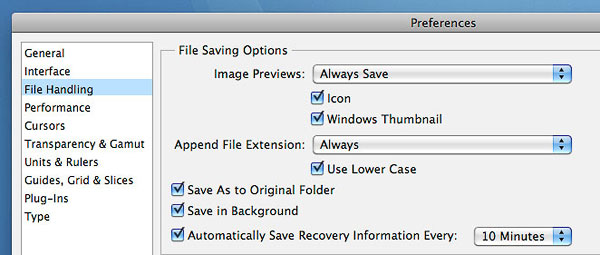 Photoshop now offers the option of saving your work in the background, while you work. When this option is selected, after you do a ‘Save’ command, you can continue to work while the file is being saved in the background. You also have the option of saving recovery information automatically at set intervals. Both options are available from the Preferences menu, under the File Handling pane: