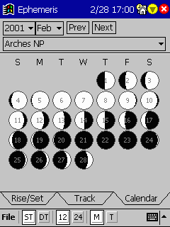 Enter the date and the location andEphemeriswill give you sunrise and sunset, moonrise and moonset times. The first screen also shows the phase of the moon, percentage illumination and whether its on the wax or the wane. The left-hand screen allows you to display the moon phases for an entire month, while the middle screen can help you pinpoint the position of the sun or moon anywhere in the sky at any time of day or night.