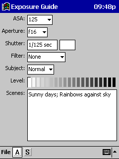 This is possibly the neatest of the three programs. In essence it’s an exposure calculator, not unlike those that existed in circular slide-rule form back in the ’50s and ’60s. Enter the film speed being used and either the aperture or shutter speed. When you select the current lighting conditions the calculator will display the missing variable.
