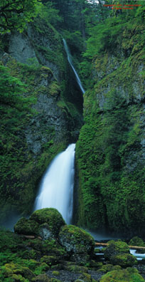 It was created from two images shot with a Pentax 6×7 camera using the Pentax 165mm lens. The two images were scanned at 1600 dpi using an Imacon FlexTight Photo scanner, yielding roughly 40MB files. They were combined using rectilinear perspective. The waterfall is Wahcella Falls along the Columbia River Gorge in Oregon.