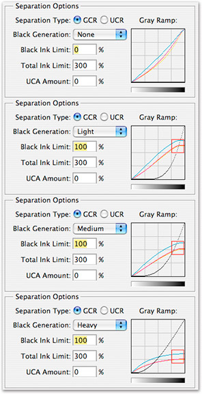 The various GCR options found in the Photoshop Classic Engine illustrates via curves what happens as GCR is increased from none, to light, all the way to heavy.