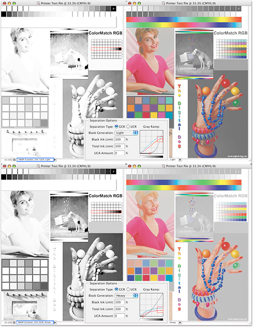 The effect of the black Slider in ProfileMaker Pro is seen here on the black channel of two separations.
