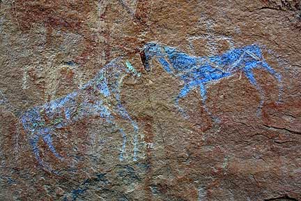 This pictograph, superimposed on an earlier petroglyph, shows two horses and therefore is likelyNavajoorHopiin origin, dating from some time after 1,500 CE, once the Spanish had introduced horses.