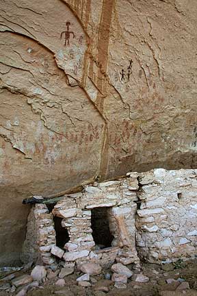 The other major danger is vandalism. Unfortunately unless the locations of these sites is kept secret, (or if within a National Park �such as Newspaper Rock fenced off), the yahoos of our society like nothing better than to deface these ancient art works. For this reason I can only say that this particular location is somewhere in Northern Arizona, under an overhanging ledge which contains an Anasazi ruin. It is at the end of a remote unpaved road and at the top of a very steep climb up a tall is slope.