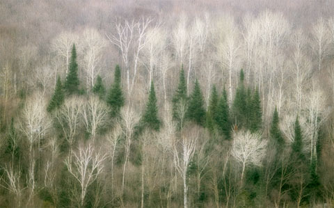 Not far from the ski resort at Mt. Tremblant liesMt. Tremblant Provincial Park. This was my first visit to the park and its beauty is quite startling. Here, the use of a long lens (400mm) compresses the perspective and lets the evergreens on this hillside stand in contrast to barrenness of the pre-spring woodland surrounding them. In a few weeks this contrast will have disappeared. Timing is everything.