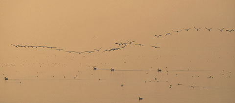 Highway 111 runs along the eastern shore of the Salton Sea and is easily accessible from the Palm Springs area. There is about a 15 mile stretch with public beaches and access points before the road swings away from the lake. On the morning in mid-January 2000 when I was there the beaches and cliffs were virtually deserted‚ except for birds‚ millions of birds.