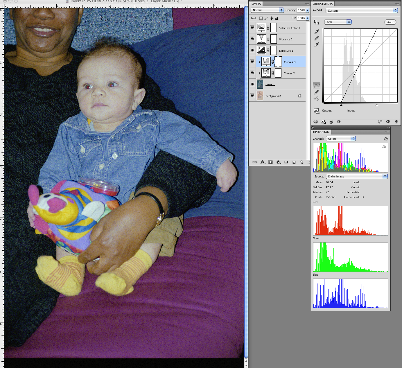 Many steps in the first procedure above to send a “raw” negative scan for processing in Photoshop can be avoided by doing something much simpler, provided your image frame includes a bit of unexposed negative material within it.