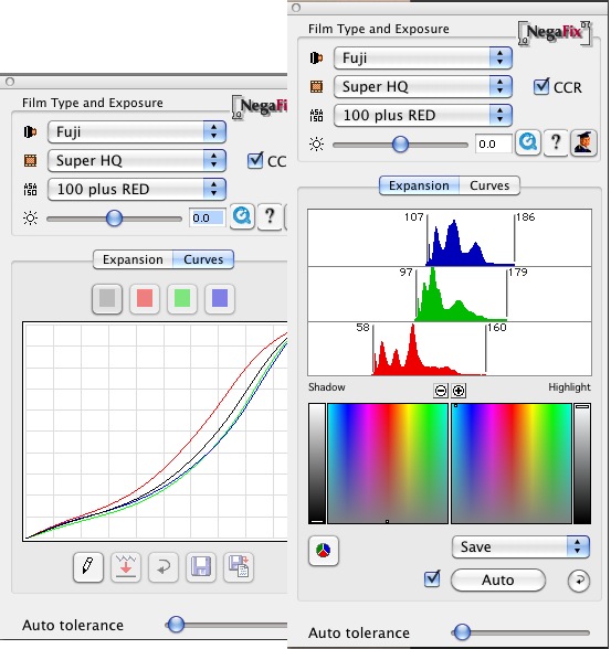 (c) To tweak a Negafix profile, first examine carefully what aspects of the negative to positive conversion need correction. If you think it is mainly a matter of exposure, use the exposure slider immediately under the film selection dialogs. If you think the overall colour balance may be an issue, try adjusting the “Tolerance” slider – this adjusts the orange mask impact on highlights (both controls shown in Figure 15 above).