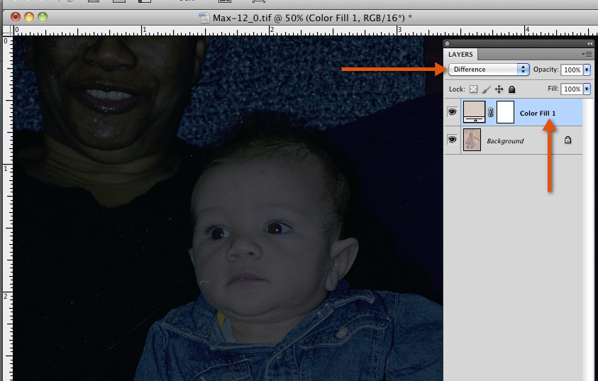 (18) Change the Blend Mode of this Color Fill Layer to “Difference” and Flatten the image. Your photo will now appear as a de-masked positive with no adjustments and looking rather dark (Figure 8).