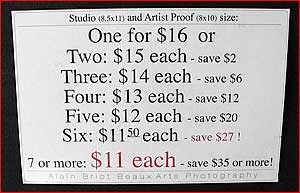 I do not recommend numbering 8×10 or 11×14 (mat size) photographs. These are your “bread and butter” sizes and I recommend you offer them in open editions to make them affordable. Number larger sizes only and price them adequately since, being numbered, there are only so many of them. Make sure you choose the edition size wisely so as not to short change yourself should the edition sell out faster than expected.