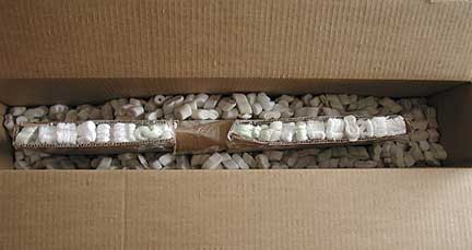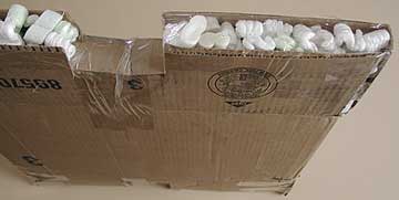 Third, completely wrap the bubbled-wrapped piece in an oversize piece of cardboard. Create crushable structures on all 4 corners and fill these structures with foam peanuts.
