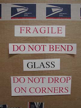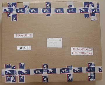 I use a variety of labels to indicate that the contents are fragile, that the package should not be bent, that there is glass inside, etc. I make my own warning labels using large red type for maximum visibility. I avoid using labels saying “Photographs” because in my opinion this makes the packages more noticeable and subject to theft.
