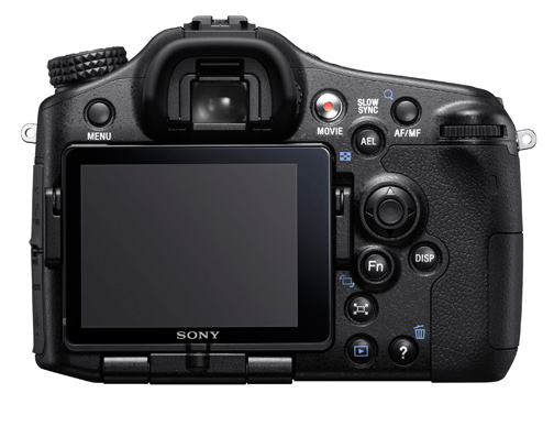 Sony has equipped the A77 with a new style articulated LCD. It is hinged in the center of both sides, and also at its base, to allow swivelling 180 degrees. This allows it to viewable from above, beneath, the left, the right of, in front and behind the camera, while at the same time providing an extremely robust hinge mechanism that looks like it could withstand a huge amount of abuse. There are even notches on its periphery that will allow Sony or some enterprising accessory maker to provide a clip-on sun shade.
