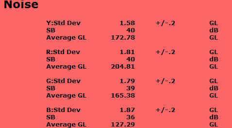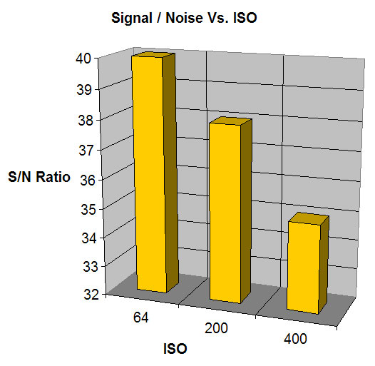 Naturally noise increases as ISO increases. Starting at 40 dB at ISO 64, at ISO 200 it has fallen to 38dB and at ISO 400 to 35db. As expected, the blue channel is noisiest, falling to 31 dB at ISO 400.
