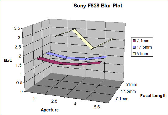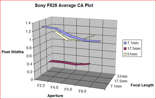 One of the chief criticisms that has been aimed at the Sony F828 is with regard to chromatic aberrations. When I first prepared the graphs above I was therefore surprised to see how low the CA numbers were. They seemed unusually low. Then I looked at the data for other focal lengths.
