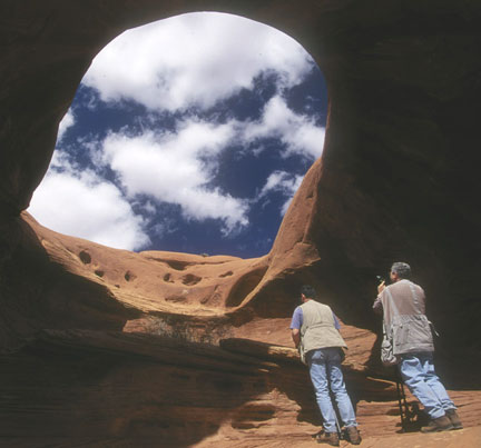 During the workshop we had an excellent guide, in Tom Phillips, who led us to some fantastic locations. I can understand why this area is considered‚³Sacred² to the Navajo people. Tom took us to numerous places that featured‚³windows.² I like the composition of this image of Steve and Michael setting up for a window shot in Mystery Valley.