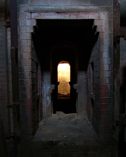 While the light shafts were gone the broken windows were casting bright patches on the walls. The brickwork’s interior was covered in places with graffiti and as I was preparing to leave the building I saw this serendipitous tableau. Of course there was no way that any form of photography could capture the huge dynamic range between the strong sunlight and the shadow areas, but that makes the image all the more fun.