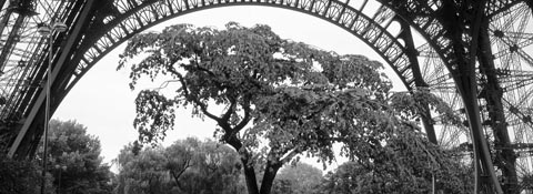 On a trip to Paris in October ’99, I was wandering along the Seine one rainy afternoon and ended up at the Eiffel Tower. A suitable subject indeed for a wide-format camera (if you like long verticals — which I don’t). I walked beneath the tower admiring its architectural grace and came across this wonderful old elm tree, whose canopy matched the arch of the girders almost perfectly.