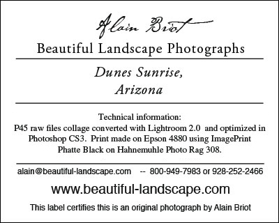 When I realized all of this, about 2 years ago, I decided to stop numbering my prints. I now only number my portfolios, the way Adams did, because they are collections of prints and not single images. Portfolios represent a body of work that was completed at a specific date and time. Certainly, the quality of the prints in the portfolio can be improved as the technology changes. However, so far I have not re-released a portfolio in order to offer a new print quality and I have no plan of doing so. The portfolios remain the same, each of them a testimony if you will to the print quality that could be achieved at a particular date and time. The prints from portfolio images that are sold as single prints do however benefit from the latest advances in printing and are continuously improved. These are not numbered. All prints, either in portfolios or not, come with a label similar to the one above.