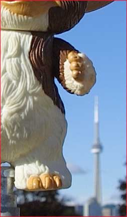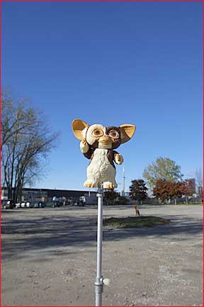 In the 28mm and 17mm frames the hand puppet is no longer visible, because to keep the gremlin doll the same size I had to get closer than 3 feet‚ inside the distance to the puppet. But, to show you what I can see in the original images I have blown up the 17mm frame so that you can more clearly see the distant tower.