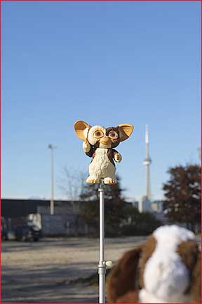 The set-up for it was as you see below. Camera on a tripod and two light stands holding test subjects‚ a gremlin, which is the main subject, and a hand puppet the other. A tall tower at infinity is the third.