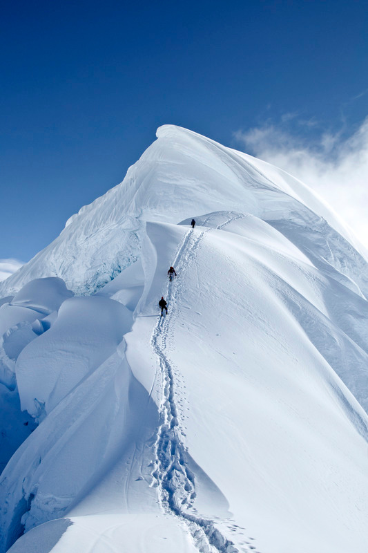 Climbers on the summit mushroom of Nevado Chopicalqui, 6354m high, in Peru