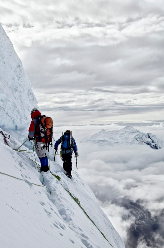 However, the blessing of mountain climbing photography is also its curse. Because it is so difficult to get there in the first place, because the climbing itself takes up so much effort and concentration, one has to make all sorts of compromises with the photography, and often bring back pictures that are disappointing, at least when compared to the experience that has just been lived. Virtually all the climbers I know bring a small point-and-shoot camera (digital or film) and use it only during long breaks and on the summit. But it doesn’t have to be. DSLRs have gotten good enough that they can be brought on a technical climbing expedition, all the way to the summit. Here is how.