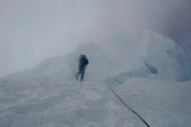 Clearing the crux of Chopicalqui’s route… or walking into the clouds.