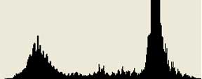 This view of the rear LCD on a Canon 1Ds shows a histogram for a particular shot and also the dotted vertical lines that Canon has engraved on the display separating the 5 stops of dynamic range that are available. As you can see this image has most of its content either in the shadows, or the highlights, with little in the mid-range.