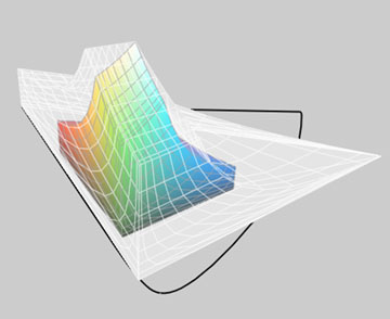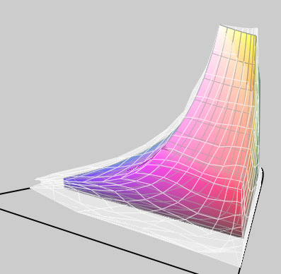 Above in Figure 4 you see the profile for the LCD screen on my 17″ Powerbook inside the ghost ProPhoto colour space. Now pass your mouse over it. What you then see is the profile for my Sony Artisan monitor inside the same ProPhoto space. The Sony is bigger, but not that much bigger. (Parenthetically, the Eizo ColorEdge CG220 LCD monitor purportedly encompass the full Adobe RGB colour space. But it’s priced at over US $6,000).