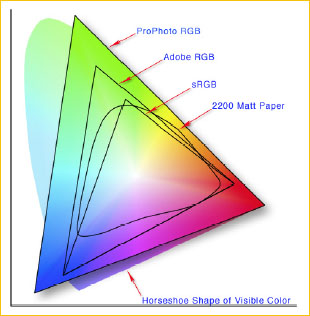 Below is a more traditional colour gamut chart. The large horseshoe shaped area shows the LAB colour space. This is the extent of human vision. Outside of this area human colour vision comes to an end. The open triangle shows the gamut encompassed by the ProPhoto colour space and the coloured triangle shows that of Adobe RGB.