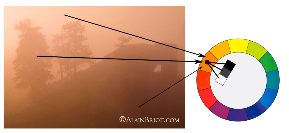 This photograph was taken at sunrise in Bryce Canyon National Park. There was a heavy layer of fog over the canyon. The sun was rising behind the fog, giving the fog an orange glow. The whole scene exhibited a natural monochromatic color harmony, the color being composed of variations of orange tones, some lighter, some darker, some more saturated and some less saturated.