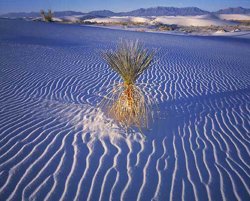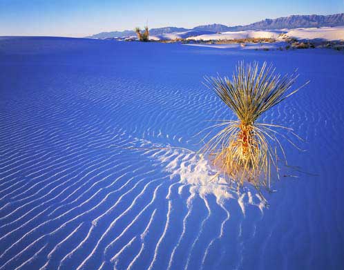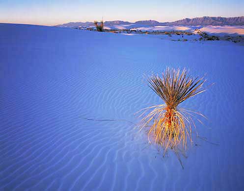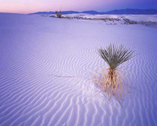 The sun rising in the eastern sky has reached the small Yucca in front of me. Behind it the dunes are still in the shade. I wait patiently until the Yucca is entirely lit and get back to work capturing on film this new natural event. The sky is now a soft pink and the distant dunes are purple. The Yucca is bathed in warm direct light while the dune around it, lit only by diffused light, is soft blue.