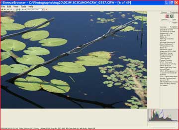 Using a file converter program is very much about ease of file access and image recognition.BreezeBrowserprovides two "screens"; the first shows a file browser to the left of screen and thumbnails to the right. These thumbnails may be viewed in three different sizes. InFigure #1above we see them at their largest size. InFigure #2you see the second screen, which shows a large view of a chosen frame along with all of the camera’s shooting data and a histogram.