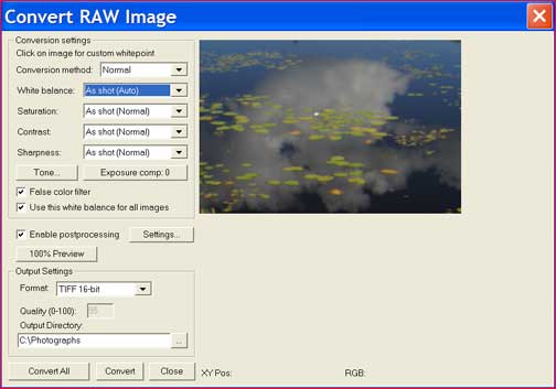 It needs to be noted that both of these programs are forWindows PCs. A comprehensive RAW conversion program does not exist for theMacplatform though a program calledGraphics Converterfor theMacwill handleCanon D30RAW files in a basic manner.